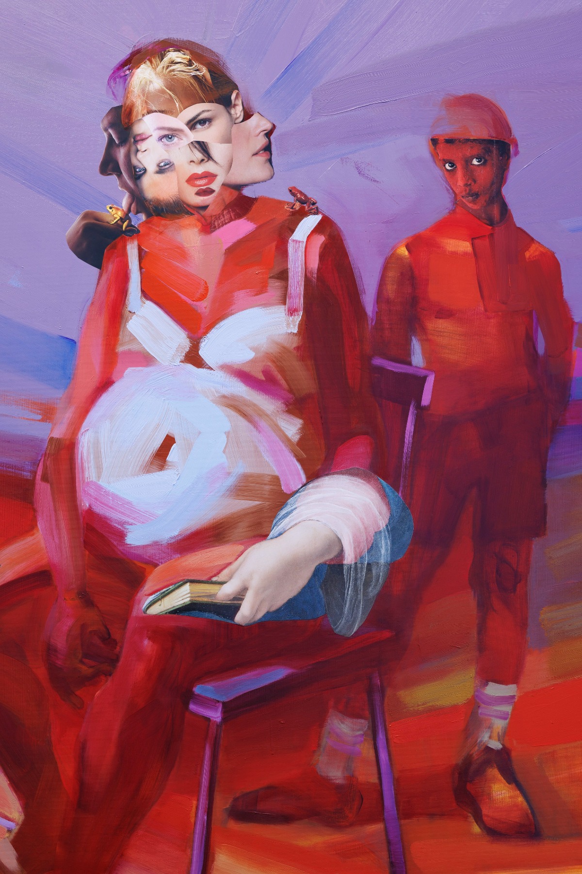 Tas ir pusaugu Jēzus! Man jau sen šķita, ka Jēzus nav baltais vīrietis. Lai kāds viņš patiesībā bija, visticamāk, viņam nebija zilas acis un gari, blondi mati. Manā darbā viņš ir attēlots savai mammai aiz muguras, un Jēzus māsiņa ir ceļā (Marija ir stāvoklī – K.F.). Es viņus gleznoju vienlaicīgi, lai varētu nolasīt, ka abi ķermeņi caur sarkano krāsu ir un paliek savienoti.