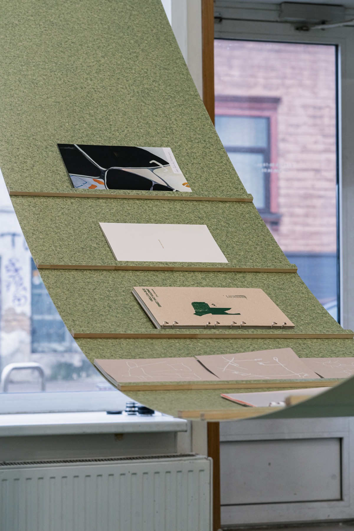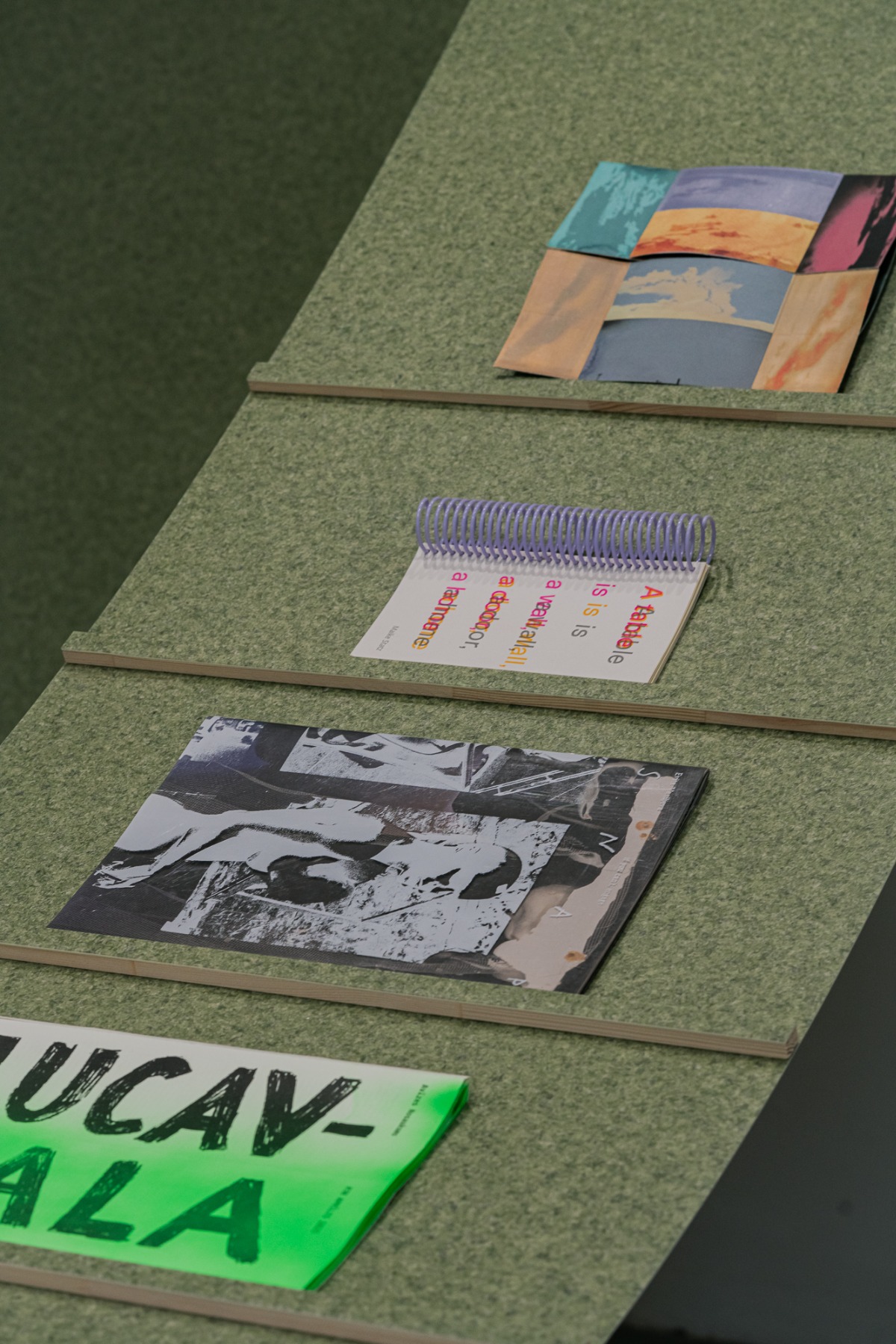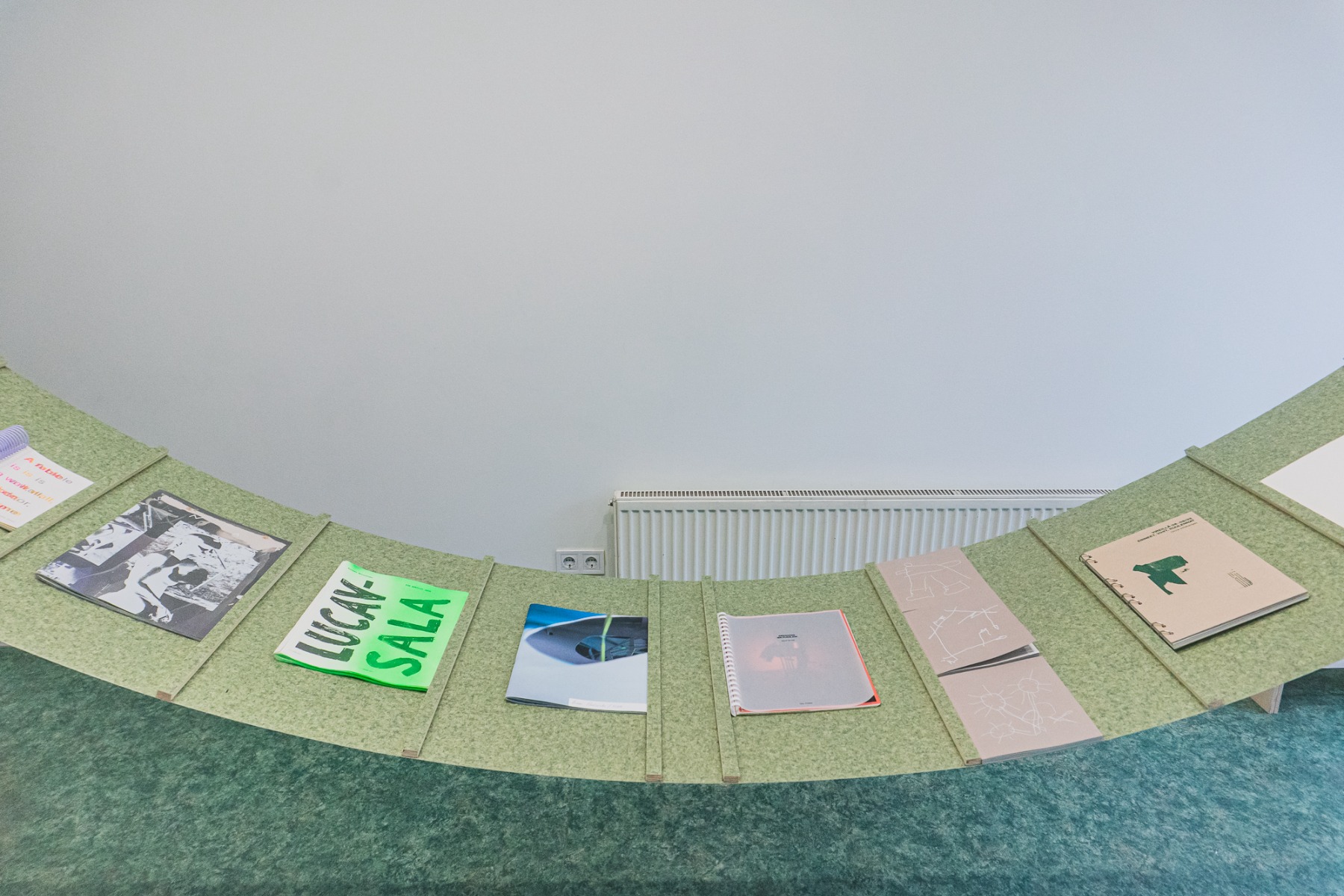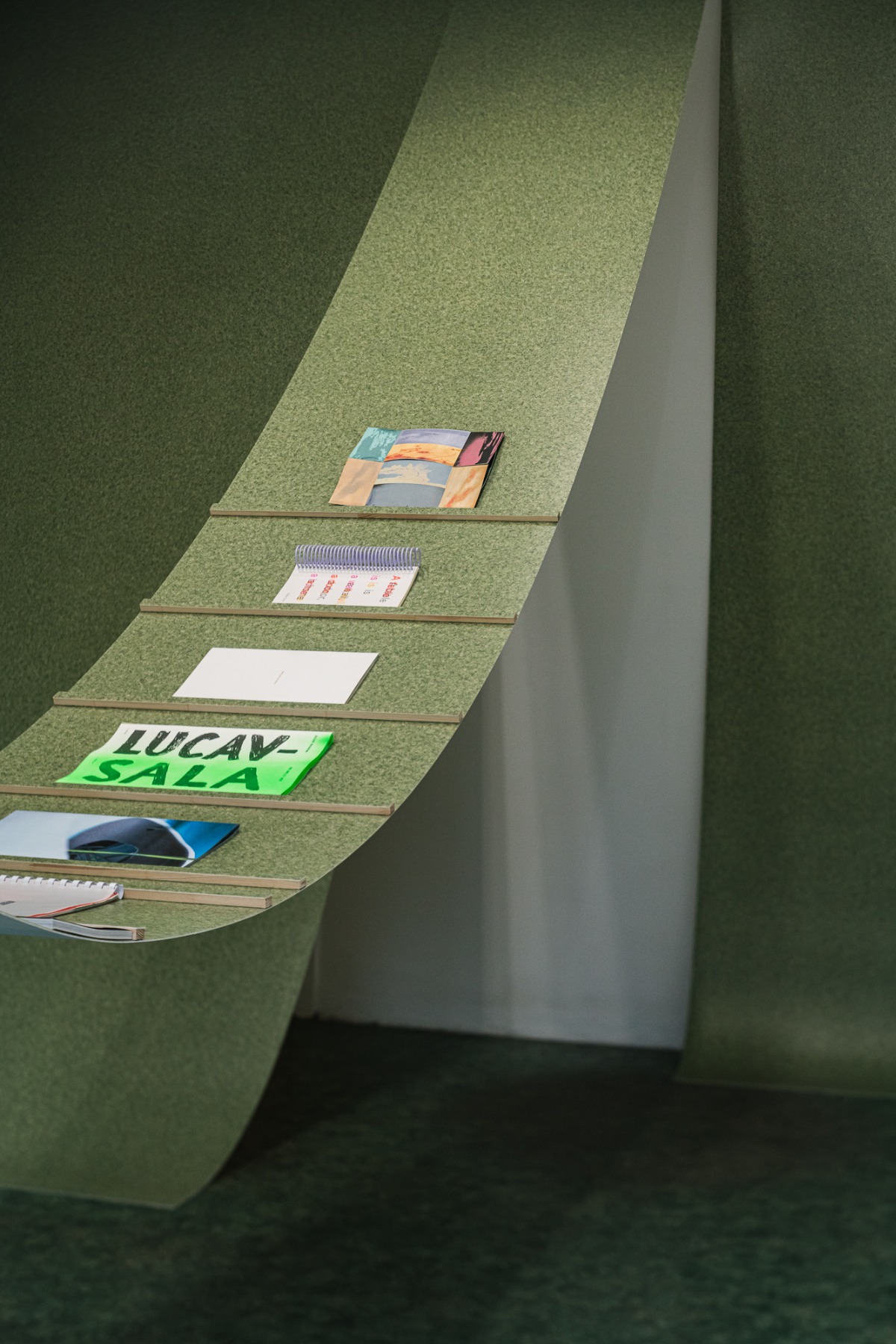 “Gaiss” arhitektu veidotajā telpiskajā instalācijā iemājo mākslinieku, arhitektu un dizaineru – Evitas Vasiļjevas ( publikācijas izdevējs Kim? Laikmetīgās mākslas centrs ), Paula Rietuma, Agneses Bebres, Kitijas Pekaines, Maikes Statz (publikācijas izdevējs Hverdag Books, Norvēģija ), Lienes Pavlovskas un Svena Neilanda – zīni un publikācijas, kā arī Olivias Viitakangas un Sauli Sirviö darbi (publikācijas izdevējs Utu Press, Somija) un un žurnāla “Avīzes Nosaukums” numurs, ko veidojuši Elīza Brice un Kristaps Šulcs.