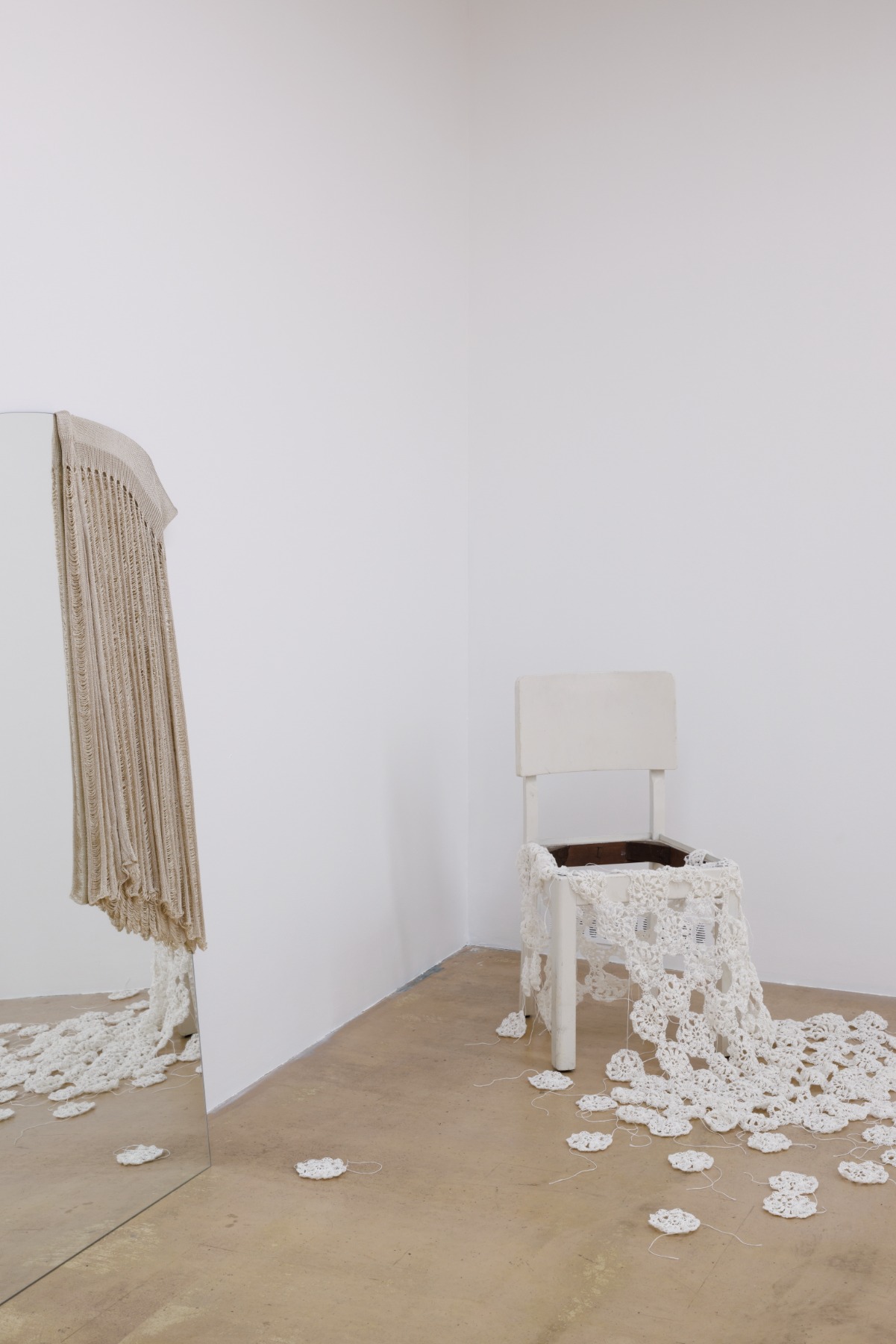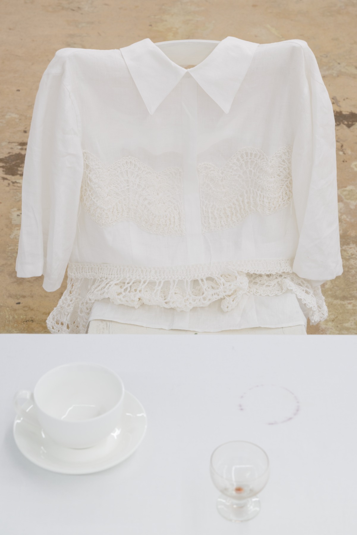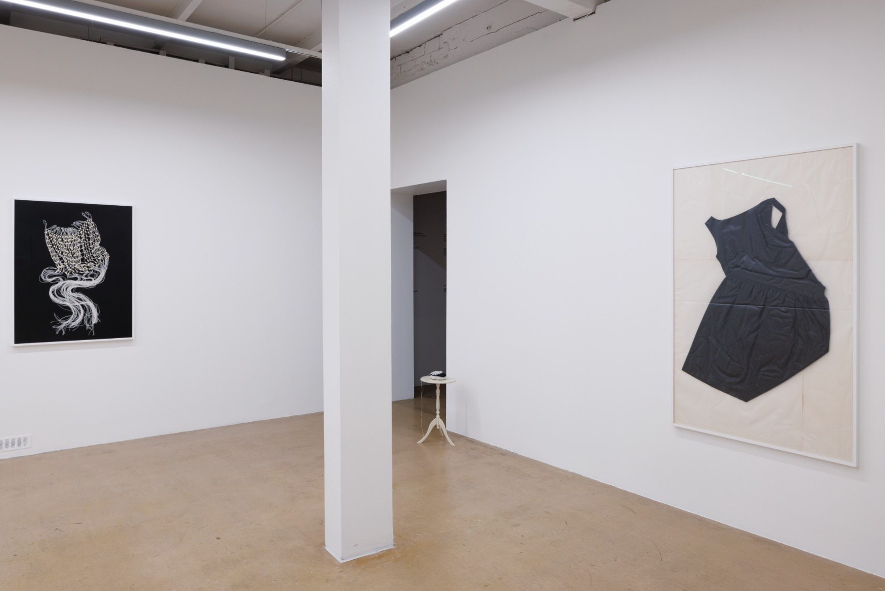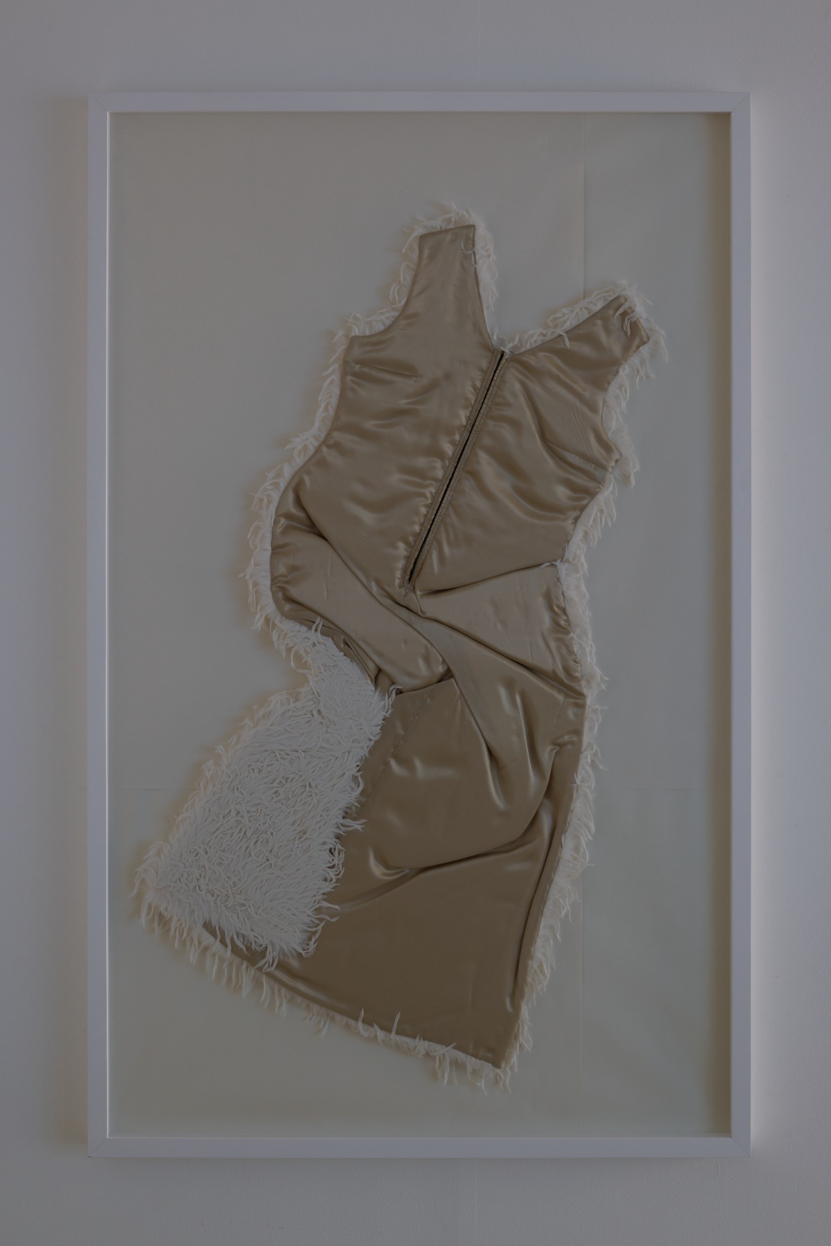 Izstādes centrā ir “nospiedumu” metode – tekstila slāņojumi, presēti un kombinēti mežģīņu, diegu, aušanas un apģērbu fragmenti. Tie izvietoti gan rāmējumos, gan telpiskās grupās kā veltījums latviskajai amatniecībai un tās materialitātēm.