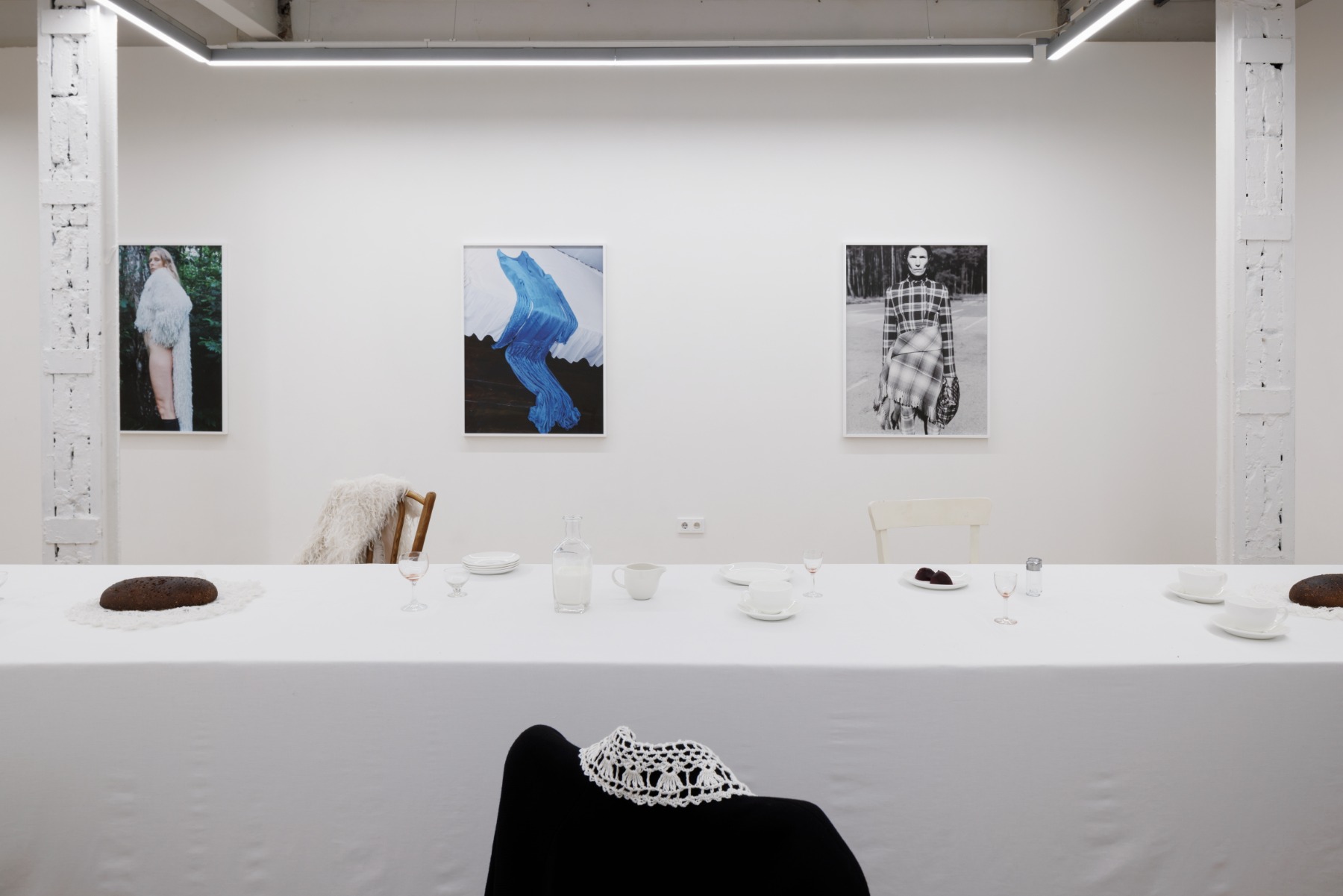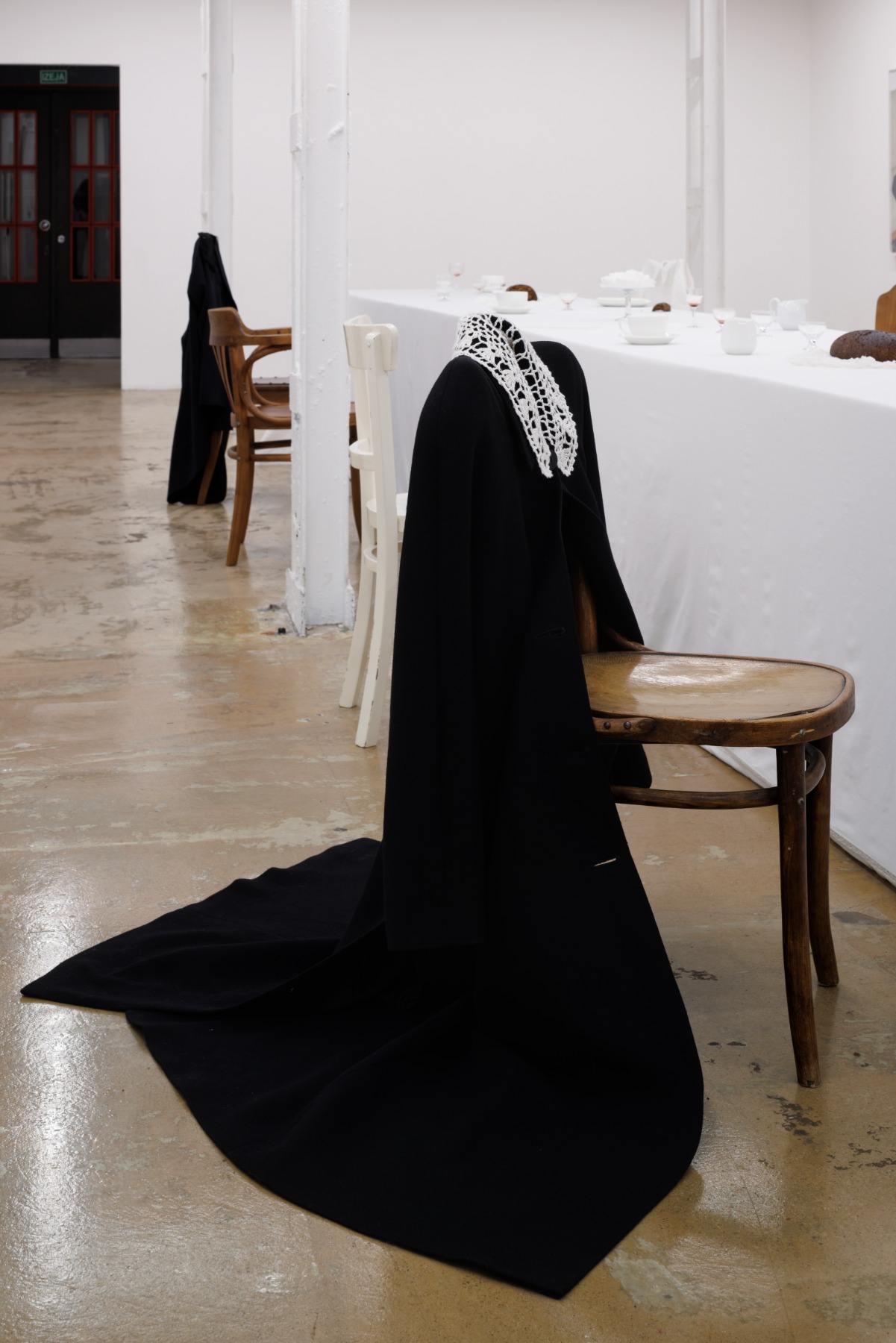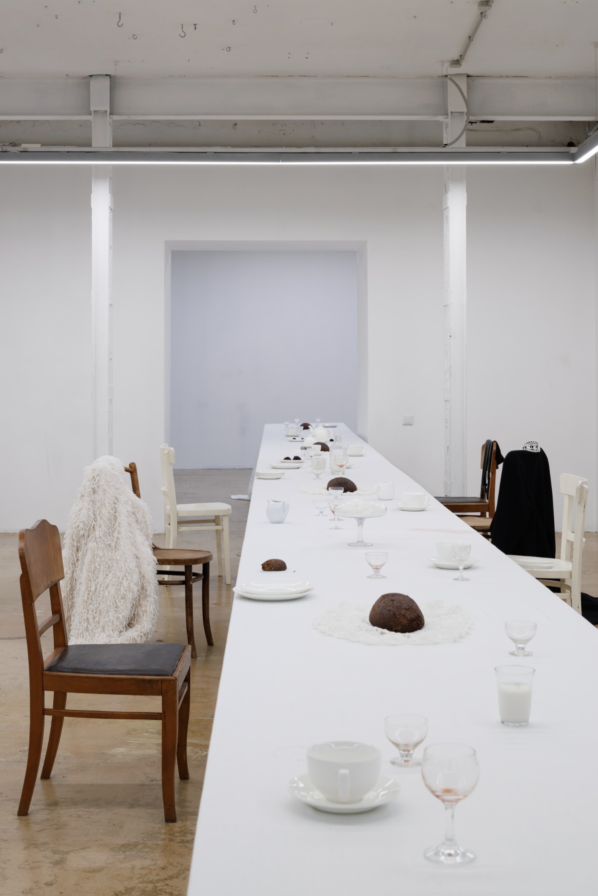 Izstādes noslēgumā scenogrāfes Halimas Dārvišas radītā instalācija – gara galda veidota satikšanās vieta – kā skatuve amatniecības tehnikām, sarunām un rituāliem.