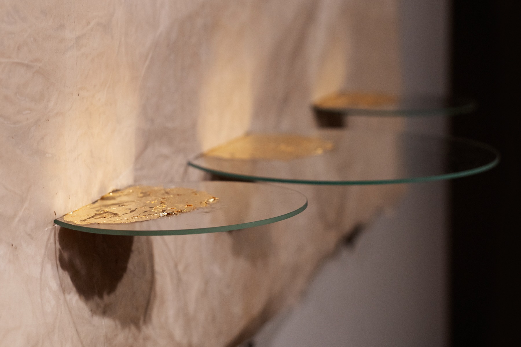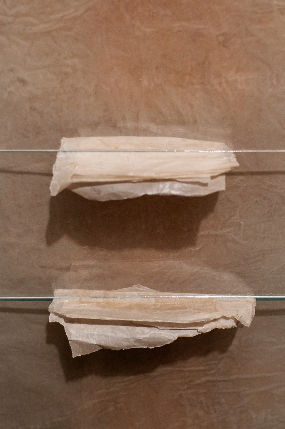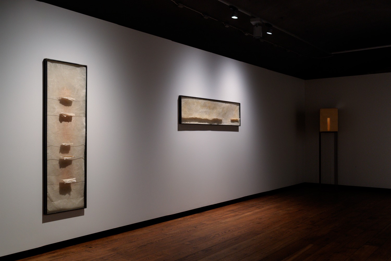 Gregorio Bota. Gaisīgais apvārsnis. Rīspapīrs, vasks, pigments, stikls. 50x200x30 cm. 2025