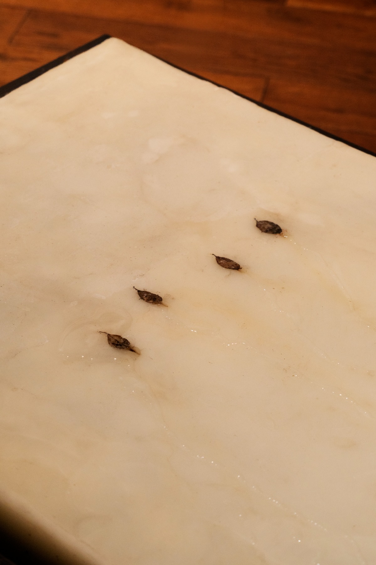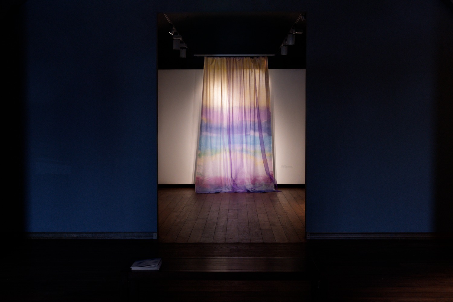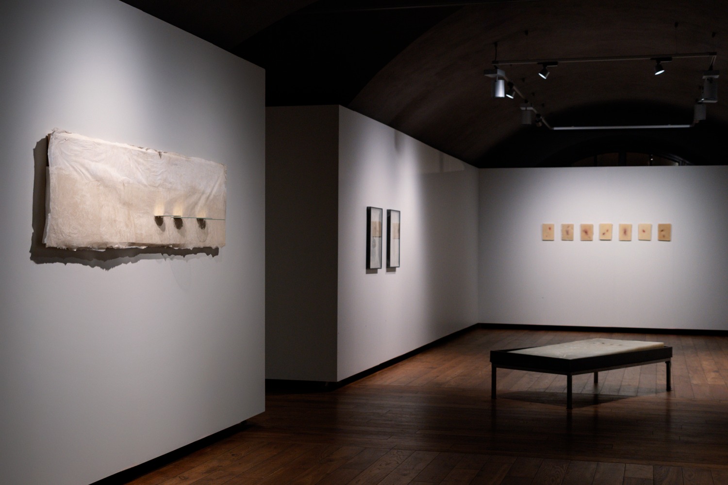 Gregorio Bota. Gaisīgais apvārsnis. Rīspapīrs, vasks, pigments, stikls. 50x200x30 cm. 2025
