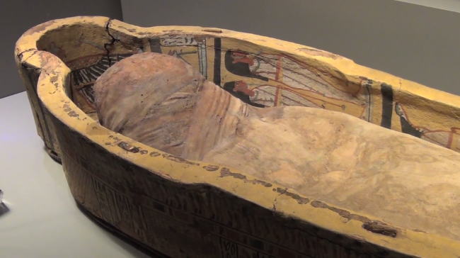 Vīrieša mūmija izstādē „Rīgas Biržā”. Kadrs no Arterritory.com video