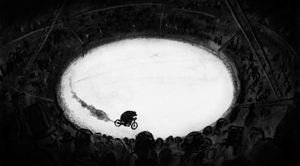 Много лет назад я получил возможность воспользоваться арт-резиденцией в Дюссельдорфе как видеохудожник. Т.к. формат мастерской был довольно свободным, я решил попробовать руку в анимации, о чём давно уже задумывался. И вот снял небольшой фильмик без какой-либо технической базы или стандартов, не зная ничего ни о технике анимации, ни о теории. Всё делалось интуитивно, и так вот продвигаясь на ощупь, я пришёл к десятисекундному фрагменту в технике углём о медведе – цирковом мотоциклисте. Главный образ фильма «Урсус» – медведь, возможно, потому, что в цирке их частично антропоморфизируют: ведь медведей заставляют заниматься такими человеческими делами, как ездить на мотоцикле или стоять на двух ногах. В мире «Урсуса» медведь как бы и человек, и как бы и нет, и становится интересно, как обе эти природы в нём уживаются. Из этого также вытекает его отношение к тому, что он делает и какую ведёт жизнь.