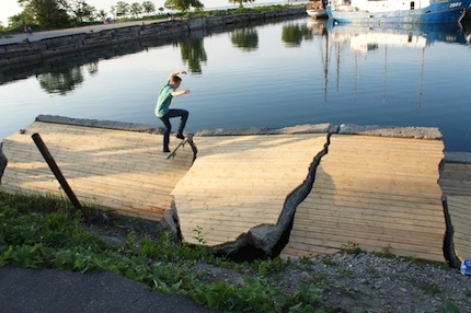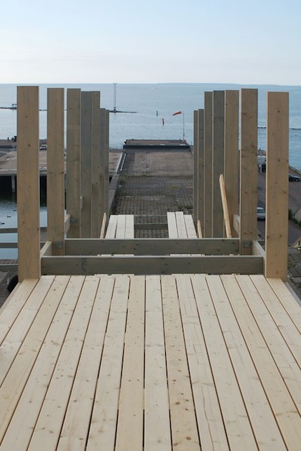 Salūzušais betons lielās plāksnēs izrobo krastu agrākai laivu piestātnei. Pārliecinājušies par atlūzu stabilitāti, arhitekti apšuva betona virsmas ar koka dēlīšiem, radot arhitektoniski savdabīgu, it kā salauztu terasi.