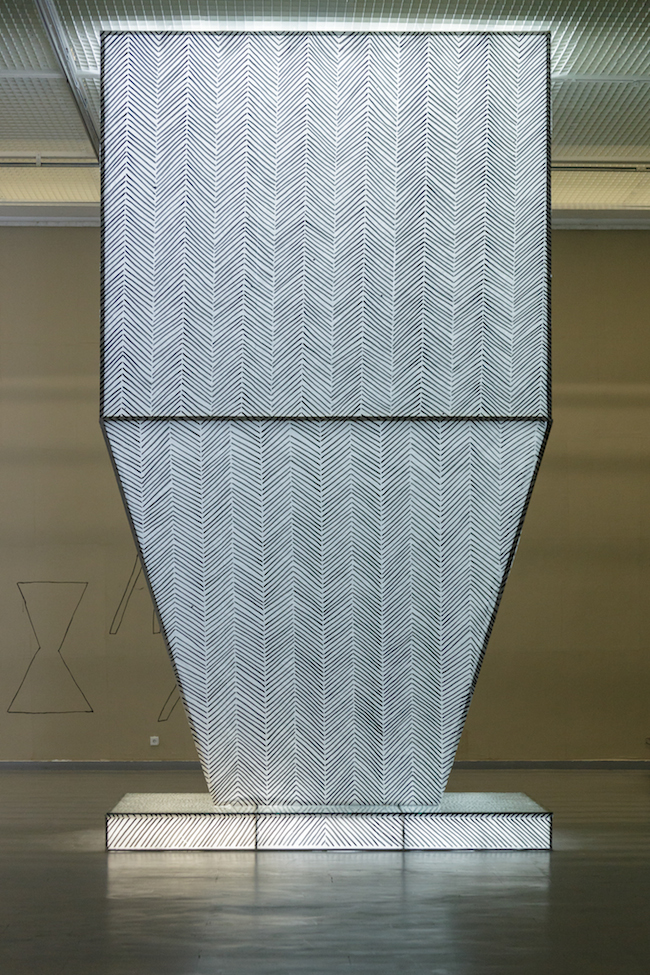 Žilvinas Landzbergas’ exhibition Crown Off could be introduced in the artist’s own words as a musical album in 3D (minimal ambient post-punk new folk neo-gothic?). In the exhibition, a ‘white cube’ located within the modernist building of the CAC – an abstract space – becomes a place with its own time and possibility for duration. The CAC spaces are taken apart and transformed; the exhibition stretches through them as a drawing, as an appendix to reality, as a dedication. By knitting together apparent materials, abstract forms, and fiction, it draws onto reality and exposes its missing parts and cracks – that which is invisible, immeasurable, unnamed.