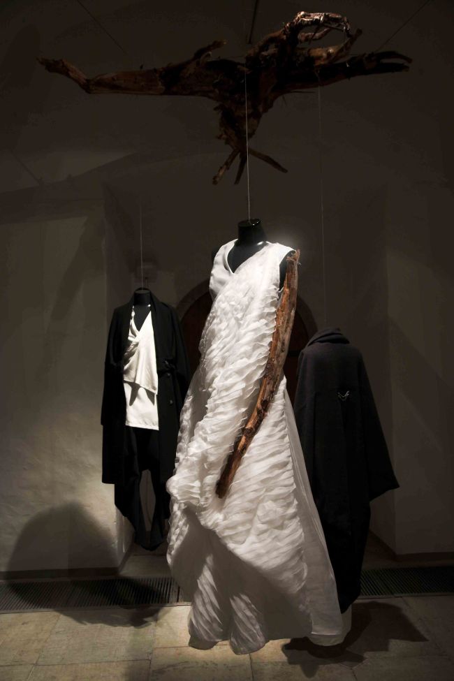 The exhibition was the starting point for this project. I gave selected designers the task of translating the concept of “Kaamos” (the dark period between October and January). I wanted to bring out the mystical and thoughtful side of fashion. The final display is like a fairy-tale, with real stumps hanging from the ceiling, and almost 100 fashion sets underneath them (designed by Hannes Praks Stuudio).