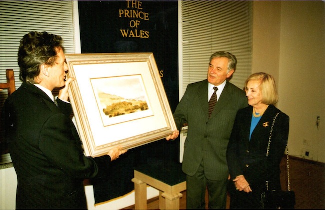The exhibition of the works of Prince Charles at Galerija VARTAI, in 1998. In the photo: The British Ambassador at that time Christopher Robbins is presenting a watercolour of Prince Charles to the President of the Republic of Lithuania Valdas Adamkus and his wife Alma Adamkienė. Photo: Džoja Gunda Barysaitė