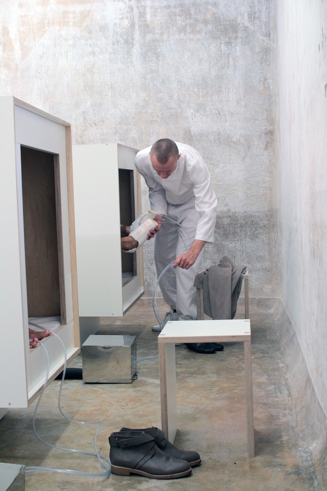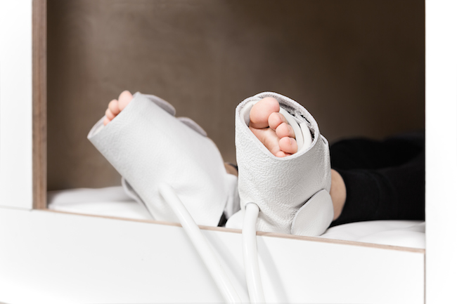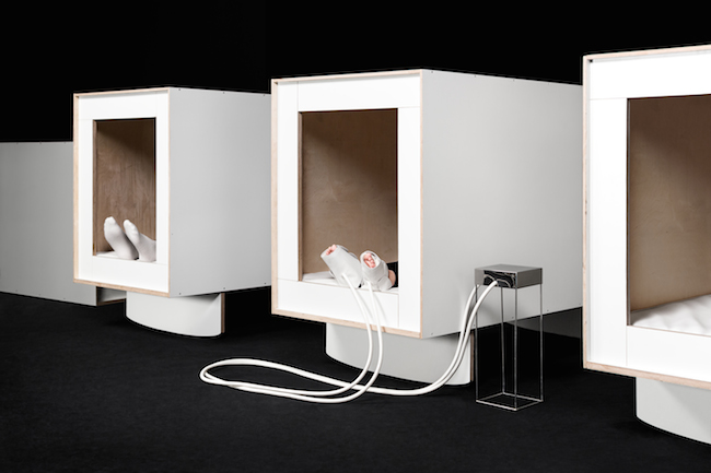 First, the project started out as a survey of the contextual background and history of the practice of dream directing. For several months I obsessively collected and read various academic papers, patents and philosophical texts on dreams. Later on, I started singling out the most cited and supposedly most successful experiments, which I then reconstructed as lo-fi models for testing in my own bedroom. This continued sporadically for over a year, until I received an invitation to take part in the 2013 Lisbon Architecture Triennale. Showing these bedroom prototypes, I thought, would not make sense as the experience they produce is totally incomparable with their appearance. So I decided to turn the equipment into a sleepover experience, a temporary hotel where everybody could come take a nap and try the dream experiments on themselves. It was quite challenging as we (my team and I) had to deal with the requirements and infrastructure of an almost fully-functioning hotel: WC facilities, safety systems, bedlinen hygiene, privacy, a booking system, etc., especially considering the unusual venue – a large concrete cube on top of what used to be a water tower. We installed a reception desk and three sleep capsules equipped with special dream-directing equipment, which, by the way, was different every time we set it up. I’d either add or remove something to echo the subject of the exhibition that the project was a part of, or simply to try out new formats of the project. For example, the current version of the Oneiric Hotel features a specially-built rocking mechanism that rocks the sleep capsule once the sleeper falls into a dream state. Since the exhibition’s topic is levitation (Gallery Q 21, Vienna), I picked a dream experiment which, reportedly, successfully induced various flying and floating activities in the dreams of the sleep-subject. More specifically, it was the dream scientists’ Leslie & Ogilvie’s series of experiments with people sleeping in swinging hammocks. So, one could say that the project is ever-evolving.