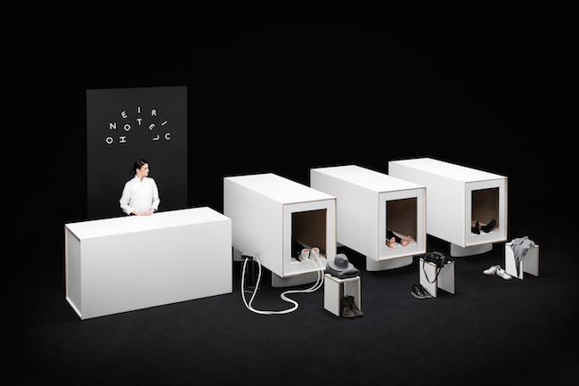 However, the design went much beyond the shapes of the capsules and the contraptions. As I mentioned before, I was particularly interested in the dialogue between the factual and the imagined. Therefore, I took my time to consider each detail of the project: the online ads, the press kits, the way people climb up to the hotel, the interior, the way the receptionists look and talk, the scent of the capsule, the micro-climate, etc. All of which create a unique experience and could be considered as important as the device that levitates you in your dream. All of this could be seen as a dream-directing placebo, which actually turned out to be very successful (I'll cover this a bit more later). That is why you find a special coverall designed by the Lithuanian designer Aistė Nesterovaitė (Formuniform), a logo by Povilas Utovka, and so on.