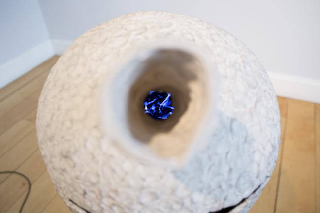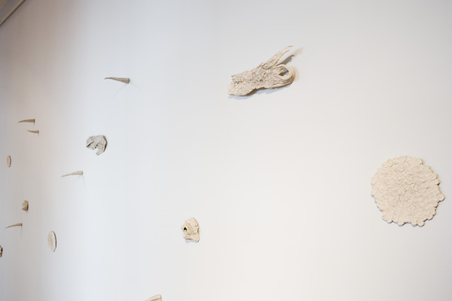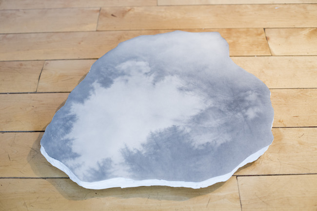 Savukārt video un skaņas instalācija “Divi soļi uz priekšu un viens solis atpakaļ” no ārpuses atgādina mālā veidotu planētu, bet tās iekšpusē – vista šamanisku mūzikas motīvu pavadījumā izpilda maģisku rituālu deju. Galerijas telpas pretējā pusē redzama skulpturāla sala “Zemu lidojošs mākonis” – tā klāta ar putnu un koku zīmējumiem, kuru autore ir Agnese Sidrevica. Šī instalācija tapusi iedvesmojoties no Lorensa Veinera tekstuālā darba The Weight of the Light / From Above.