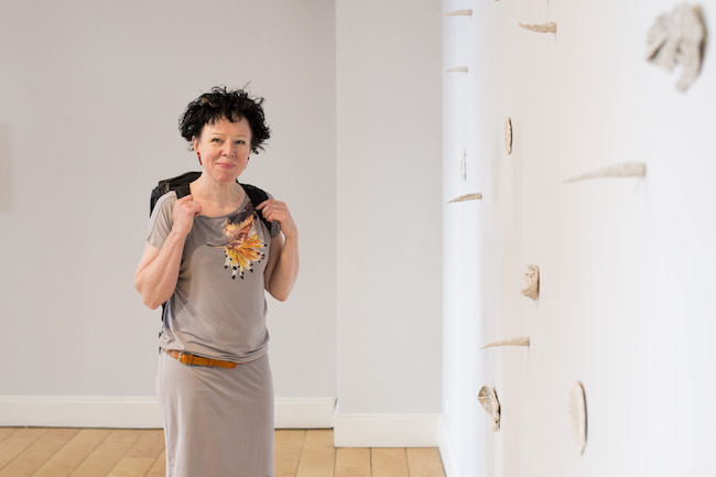 Māksliniece Daiga Krūze pie instalācijas “Divi soļi uz priekšu un viens solis atpakaļ”