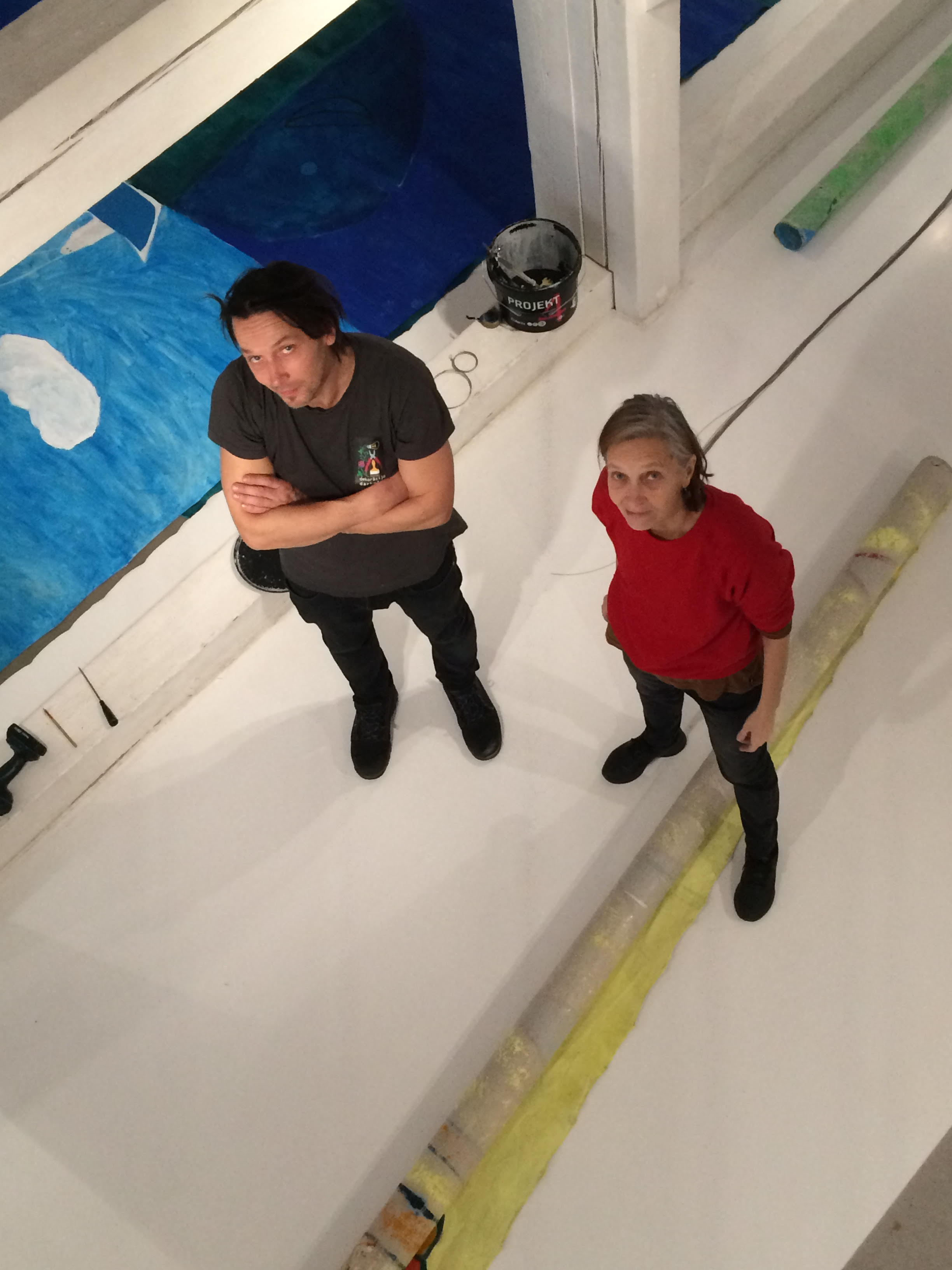 Aija Zariņa ar dēlu Arni Zariņu, iekārtojot izstādi. Foto: Aija Ansone