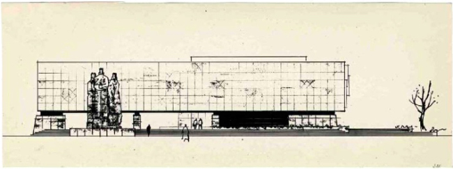 Latviešu sarkano strēlnieku muzeja-pieminekļa projektēšanas stadija. Rasējuma foto.