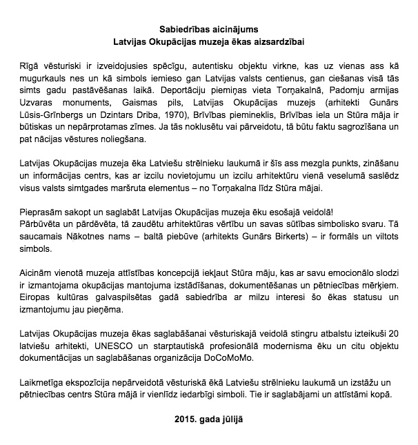 Sabiedrības aicinājums Latvijas Okupācijas muzeja ēkas aizsardzībai. Pret piebūves celšanu iespējams parakstīties Zaigas Gailes birojā.