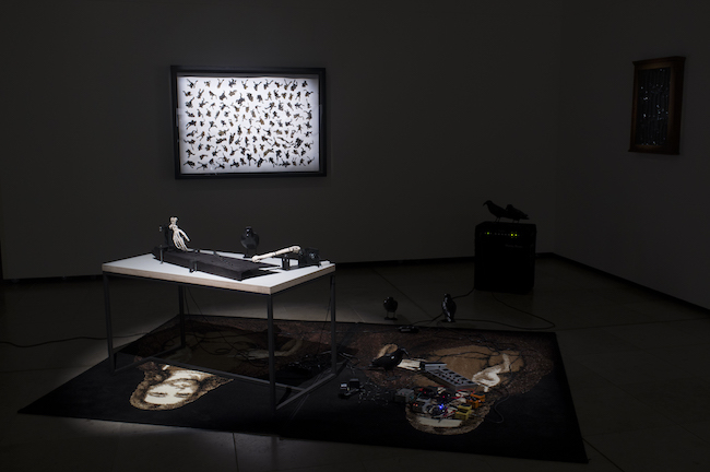 Apdullinošie skaņu trokšņi savienojumā ar aptumšotajām telpām rada draudīgu atmosfēru, kas ieguvusi tikpat lielu nozīmi izstādē, kā priekšmetiskā vide. Izstādē var runāt par trīs skaņām – katrā telpā savu. Foajē to rada milzīga melna radība, kas līdzinās piepūšamai reklāmas atrakcijai pie lielveikaliem. Otrajā zālē skan kokle, ko spēlē skeleta rociņa un kauls. Kauls it kā neritmiski pret pārējo skaņu vilni piesit ritmu, un automātiski spēlējošās rociņas skaņa ar pedāļu palīdzību tiek pārvērsta īstenās elektroniskās „nāvītes” mokās. Brekte to sauc par „Tautu dēlu dziesmu”, un šī dziesma iegūst pavisam citu nozīmi, kad uzzinu, ka kokli ir taisījis pats Brekte. Kokle un tās radītā skumjā melodija, manuprāt, ir izstādes centrs, ap kuru apaug visa pārējā ekspozīcija. Trešajā telpā skaņa nāk no nenosakāma avota, tā izplatījusies pa visu tumšo telpu, liekot sajusties kā bunkurā. No griestiem karājas melnas degvielas bākas, radot sajūtu, ka biedējošā skaņa nāk tieši no to iekšpuses. Bet tie nav pašmērķīgi skaņu efekti, skaņa iedarbīgi līdzdarbojas un pārņem izstādes telpas – gandrīz kā vēl viens taustāms objekts.