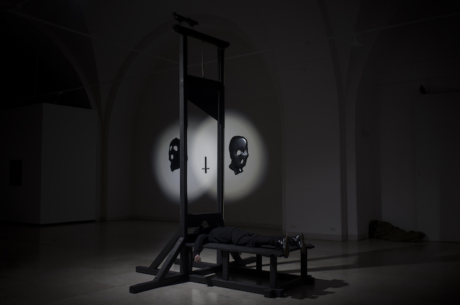Šķiet, ka izstāde nesastāv no daudziem darbiem (kā tas skaitliski tomēr ir), bet tie izvietoti visās „Arsenāla” zālēs kā vienots veselums. Tā ir Kristiana Brektes skatuve, kurai nepieciešama telpa un kas manā stāstījumā kļūst ne tikai par Arsenālu, bet par Nāves salu, uz kuras spoguļojas kara mašinērija benzīna bāku ietvarā, iegūstot cilvēka iekšējo orgānu formas, nāves trokšņi, visredzīgi lakoti kraukļi pat visneredzamākajos un melnākajos nostūros, giljotīna ar ļoti spožu un uzasinātu nazi, no kura, tuvumā pienākot, pārņem šermuļi, skeleti un glazēti galvaskausi, altāris, tumsa un guļošs karavīrs aizdurvē, mežs, iestrādāts pulkstenis mazā tankā un nāves smakas odekolons[3], iemūrēts vīrs ar melnu kapuci. Objekti šķiet speciāli novietoti neredzamās vietās, lai ik reiz atklātos kādi jauni slēpņi.