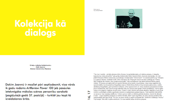 Žurnālā lasāma saruna ar norvēģu mākslas kolekcionāru un viesnīcu īpašnieku Peteru Stūrdālēnu, kura ambīcijas, eksponējot mākslu savās viesnīcās, ir mudināt cilvēkus aizdomāties. Norvēģu miljardiera Kristiana Ringnēsa iniciētais Ēkebergas skulptūru parks radies no vēlmes kaut ko atdot atpakaļ Oslo – “pilsētai, kuru es mīlu un kura man sniegusi tik brīnišķīgas dzīves un lieliskas profesionālās karjeras iespēju”. Savukārt vācu mākslas kolekcionāres Ingvildas Gecas ap pieciem tūkstošiem mākslas darbu ietilpīgā kolekcija Sammlung Goetz ir attīstījusies pārsvarā no saskarsmes ar jauniem māksliniekiem, daudzi no kuriem atradušies sava ceļa sākumā. Grieķu mākslas kolekcionārs Dimitris Daskalopūls, kas pazīstams ne tikai kā īpašnieks vienai no mūsdienu konceptuāli spēcīgākajām laikmetīgās mākslas kolekcijām, bet arī kā viena no ietekmīgākajām personībām šībrīža mākslas ainā kopumā, savu kolekciju uzskata par krātuvi: “Tā ir pieejama muzejiem, var tikt aizdota – es dalos tajā, cik vien iespējams.” Itāļu modes leģenda Lučano Benetons žurnālā stāsta par savu ambiciozo Imago Mundi projektu, kuru veido 19 mazformāta mākslas kolekcijas no 38 valstīm un kura mērķis ir atgādināt, ka idejas, nozīmes un iedvesma nav monopols – tās radušas mijiedarbībā un komunikācijā Rietumiem ar Austrumiem, Ziemeļiem ar Dienvidiem, krustojoties pasaules kultūru pieredzēm.