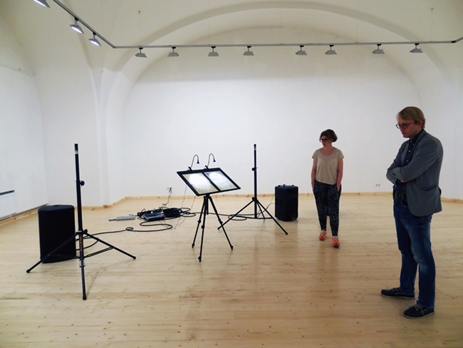 Anna Salmane un Kristaps Pētersons iekārtojot izstādi “Dziesma”. Foto: Krišs Salmanis