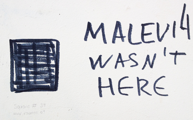 То есть можно разглядеть номер работы (№ 34), а также ссылку на сайт (www.raumen.at). Как ни смешно, тоже из австрийской зоны. И да, по ссылке в самом деле разнообразные вариации квадрата Малевича. Вообще есть некоторые проблемы – во первых, работы № 34 в каталоге нет, в проекте «100 Black Squares» дошли только до (https://www.raumen.at/de/werk/100_Black_Squares_008_s0.html) № 8. Но кто ж тут обещал быть тщательным? Во-вторых, не совсем понятно, кто это делал. Что ли франшиза? Сомнение вызвано написанием malevi4 – как-никак, для этого автор должен был хотя бы отчасти знать русский – ну, эта четвёрка. Но опять же, не важно, главное – что существует на стенке, причём – со ссылкой. Так что всё как-то распространяется. Позже я вспомнил, что ещё один схожий (но не в точности) малевич был на Покровке возле Лялина переулка, но там его быстро закрасили – что, конечно, также входит в не так чтобы какую-то игру, но в процесс.