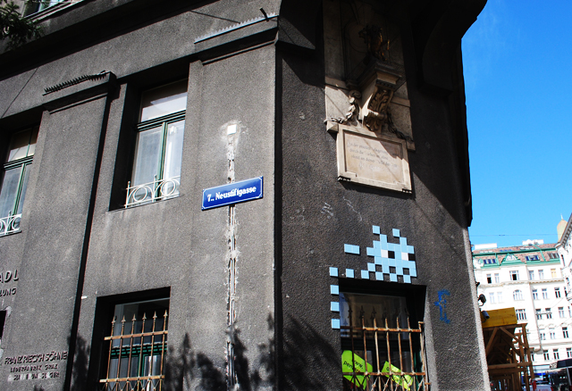 Эта история из разряда других проектов. Например, есть такой Space Invaders, он у меня в «Вене, операционной системе» был чуть ли не самым главным во всём тексте. Там, собственно, проект даже не внутренне-городской, а международно-городской. Некий человек производил в разных местах разных городов разных стран пиксельных персонажей из Space Invaders – игры для игровых автоматов (появилась в Японии, в 1978-м). Вот так один их них выглядит в Вене. Угол Нойшитфгассе и Келлермангассе, на Аугустинплатц.