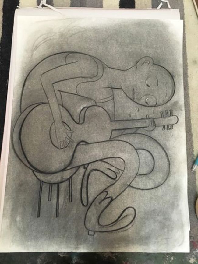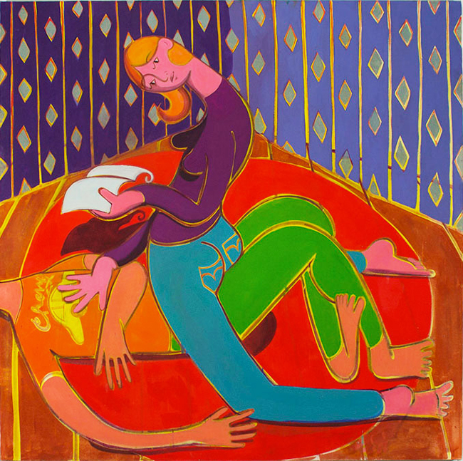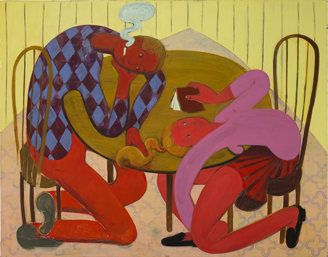 Тут, понятно, вытянутость конечностей не главное, довлеет вписывание фигур. Авторское пояснение: «Человеческие тела – то, что все мы опознаём тут же. Поэтому их искажения вызывают немедленную реакцию, и наши мозги начинают потрескивать, пытаясь осознать зазор между тем, что изображено, и тем, как должно бы быть». От себя BLOUIN добавляет, что история искусств автором задействована, в качестве прецедентов упомянуты живописцы маньеризма, средневековые светильники, Уильям Блейк, Пикассо, «La Grande Odalisque» Энгра и «Пьяные фигуры» Билла Трейлора.