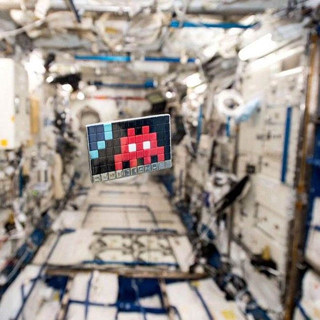 А это – то и личное, и почти уже вечное. Invader воспроизводит в разных местах разных городов разных стран пиксельных персонажей из игры Space Invaders – для игровых автоматов (сделали в Японии, в 1978-м). Пикселеобразные герои в кафельном виде выкладываются на стенах. Могут быть крупнее, из отдельных плиток, могут быть лаконичнее – как в данном случае, для космической станции. Space Invaders на Space Station – это логично, по факту они вернулись в свою среду обитания и, надо полагать, не исчезнут в варианте Mission Complete, эта станция далеко не улетит.