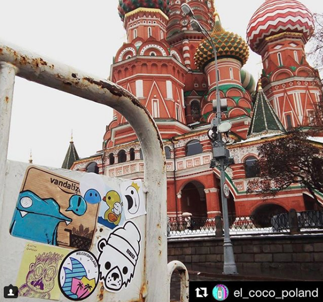 А этот был приклеен в Москве поляком (судя по подписи). Да, любопытно, как на этом полицейском ограждении на Красной площади системно отмечаются иностранцы, – другие стикеры тоже не очень-то не местные.