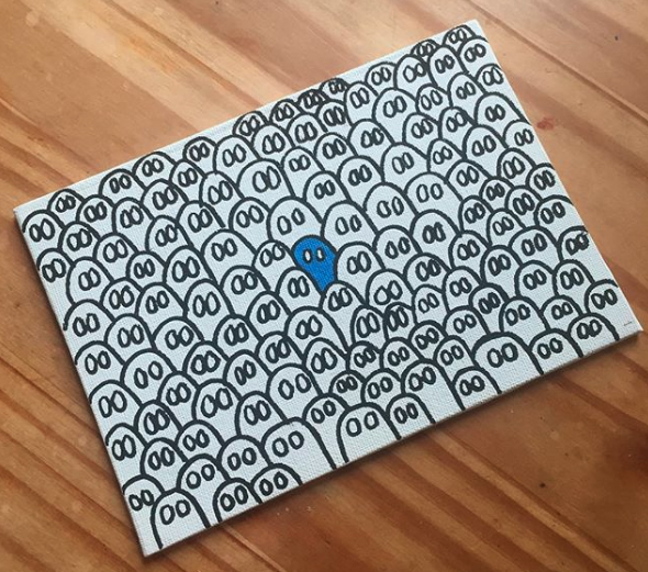 Тревожность здесь – не состояние, а персонаж. То есть состояние тоже, но главное – он. Это анонимный проект Anxtii (от Anxiety): «Anxti's are lost, apprehensive, creatures. Anxiety sufferers of the world let's unite!». Ничего больше о проекте не сказано. Работы размещаются в Инстаграме и Твиттере. Твиттер, разумеется, @Anxtii. Так же зовут и автора. Его мейл тоже, конечно, anxtimail@gm..l.com. Проект не строго индивидуальный, там и работы заинтересовавшихся. Вообще, непонятно: исходный Anxtii – это один человек или нет? Может, небольшая группа. Но, скорее, все же одиночка, который придумал персонажа и представляет его в разных видах и обстоятельствах.