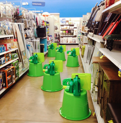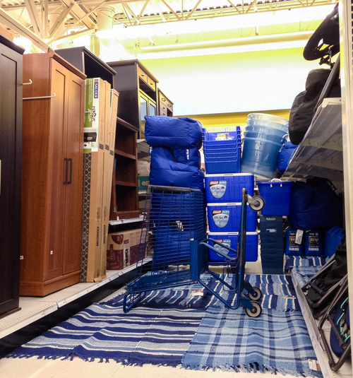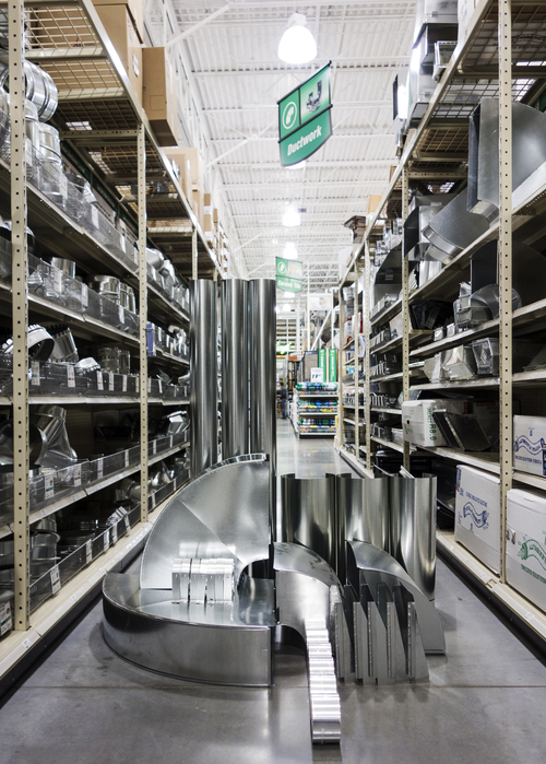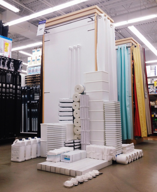 Проект Mass, автор – Carson Davis Brown. «Масса: производство визуальных сбоев в массовых пространствах». Логика проекта проста и изящна. Художник идёт в торговый центр – стройматериалов в данном случае. И производит выкладки из местных товаров. В принципе, почти такие же, какие там всегда, только это уже авторские объекты.