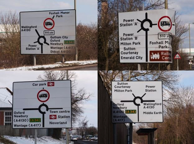 Возвращаемся в 2018-й. В этом марте в той же Британии на указателях трассы A4130 около города Didcot (Oxfordshire, Ирландия) появились Нарния, Middle Earth (Средиземье), Gotham City (в нём происходит действие историй о Бэтмене), Изумрудный город, Neverland.