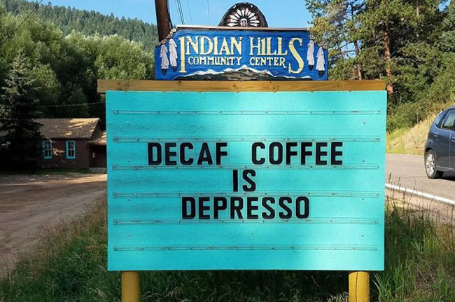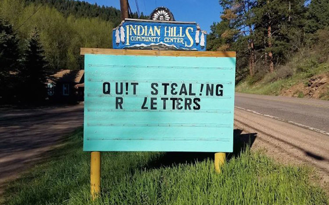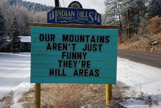 Это Indian Hills Community of Colorado, там живёт Vince Rozmiarek. Пять лет назад на 1 апреля он сделал первую штуку такого сорта: Indian Hills annexed by Morrison, slow down. «Indian Hills аннексированы Моррисоном, сбавь скорость». Имелось в виду, что в городе Morrison (рядом с Indian Hills) усилилось присутствие полицейских с радарами. Конечно, на это водители внимание обратили. Ну, а потом так и стал что-то сообщать, выходя с чем-то новым раз в две недели примерно. Теперь вот и в прессу попал. По поводу пишет, без повода.
