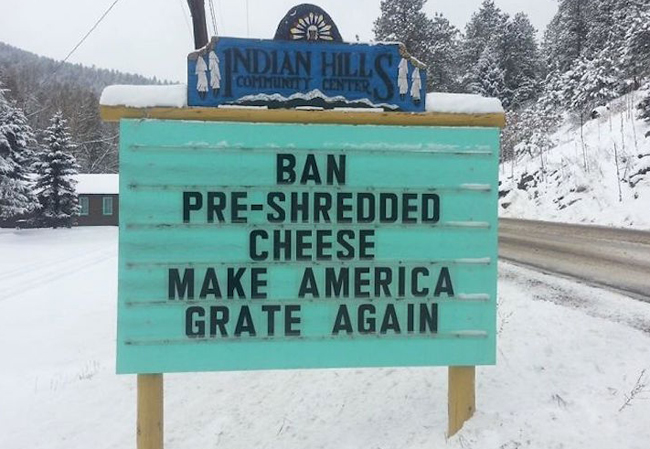 «Запретить продажу измельчённого сыра, сделаем Америку снова натирающей». Grate – great, отвечает актуальности политического момента. Следующее – что ли, издёвка над рекламой из путеводителей.