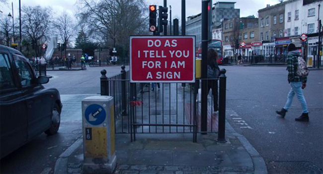 Но это не системно, конечно. Должны быть и системные работы того же рода. Да, есть даже совсем системные, то есть – не на улицах. В 2015 году было целое мероприятие на эту тему, Artists and Graphic Designers Remix Everyday Street Signs. Отмечалось пятидесятилетие нынешней британской системы дорожных указателей. В 1965-м Margaret Calvert and Jock Kinneir создали шрифты и стандартизировали графику знаков для дорог Британии. По этому поводу проект «Дорожный знак» (British Road Sign Project) предложил художникам/дизайнерам что-нибудь предпринять с этой классикой. Дело было пафосное, предлагалось «уйти от инструктирования людей об ограничениях скорости и направлениях в сторону поэтического нарушения повседневной рутины, заставляя нас останавливаться, смотреть и думать о нашей среде несколько иначе – меньше инструкций и больше пауз для размышлений». Понятно, это всё для выставки в лондонском Design Museum in London. О них и The Guardian написала.