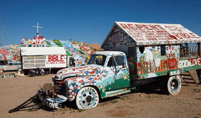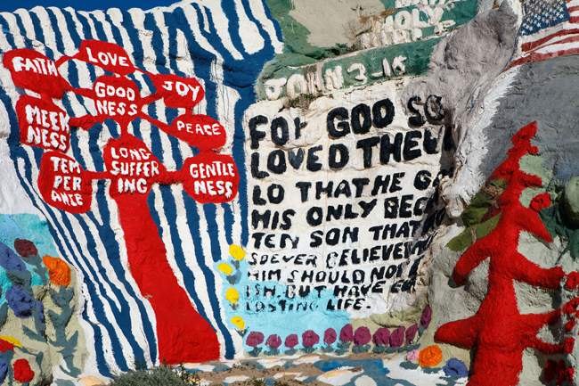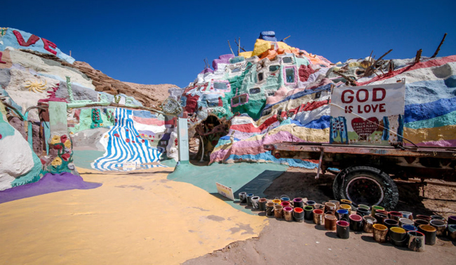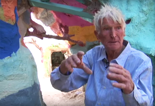 Понятно, что такие переживания случаются со многими людьми, но Knight не ограничился личным преображением. Сначала он решил сделать воздушный шар и написать на нём, само собой, «God is love». А он был разнорабочим, сварщиком, давал уроки игры на гитаре, красил автомобили. Зарабатывал, копил и в начале 1980-х сделал в калифорнийской пустыне свой шар. Но шар рухнул и изодрался. Он было решил сделать другой, но обернулось иначе. Knight завис в Slab City, California («в пригороде сквоттеров, хиппи, дрифтеров и перелётных птиц» – как пишут в статье). Там и жил до смерти в 2014-м двадцать четыре года. Новый шар делать не стал, начал строить гору.