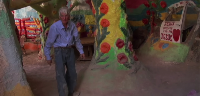 Я-то, по крайней мере, знаю, почему решил написать – и неизвестная история, и красиво у него получилось, и есть в этом что-то конструктивное. А ещё потому, что там солнечно и ярко, а тут начинается сырая осень. Да и не заниматься же только новостями. В общем, дело было так. Как-то раз Леонарда Найта (Leonard Knight) пробило: «Я остановил свою машину на обочине и начал говорить „Иисус, я грешник, пожалуйста, приди в мое сердце”». Так он вспоминал в документальном фильме 2013 года: «Я плакал, слёзы застилали мне глаза. Я был одинок». И в этот момент ощутил поблизости наличие чего-то высшего. Вот этот фильм.