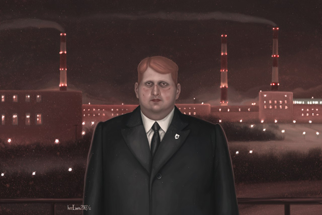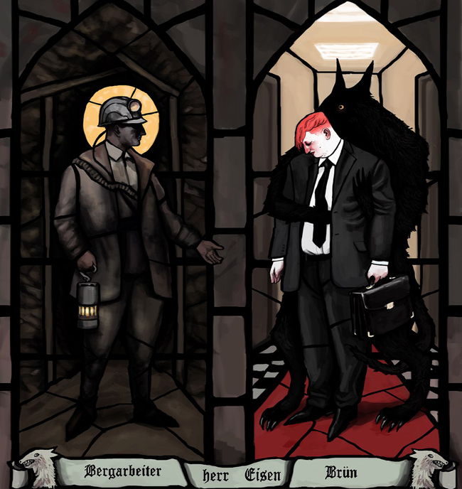 Вроде назван автор, но нет – потому что в F.A.Q. на Vk сообщено, что это псевдоним (всё в том же образе – Железнова, железо, Айзен). Вообще, «Луна» как-то сразу убрала нахождение проекта в нигде, даже без вопроса на эту тему: тут уже конкретно «дымящие трубы сибирских заводов», да и «российская реальность». Невзирая «на мотивы немецкого Средневековья» и как бы готический шрифт надписей на картинах. Заодно о стилистике новых СМИ – вот уже «паблик», а будет и «сеттинг»: