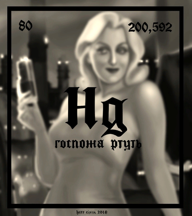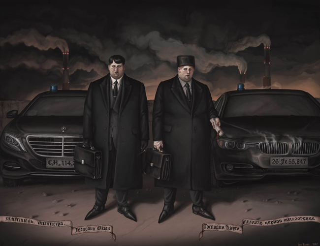 Основные типажи/персонажи – министр Айзен («железо» по-немецки, Eisen), Октан, Нефть (дама-брюнетка). Будут ещё какие-то из таблицы Менделеева. Действия статичны, структуру отношений не производят – по крайней мере в развитии. Не нарративный сериал, в общем. Это если о картинках. Вообще, нормальные картинки, будут неплохо выглядеть на стенах – хотя бы и министерств. Собственно, тема «Министерство чёрной металлургии» тут не очень, какое отношение к нему могут иметь Октан и Нефть. Неважно. Нефть, она тоже чёрная. И тоже, в принципе, нордическая, как Штирлиц. «Чёрная металлургия» здесь не промышленность, оно типа смутное.