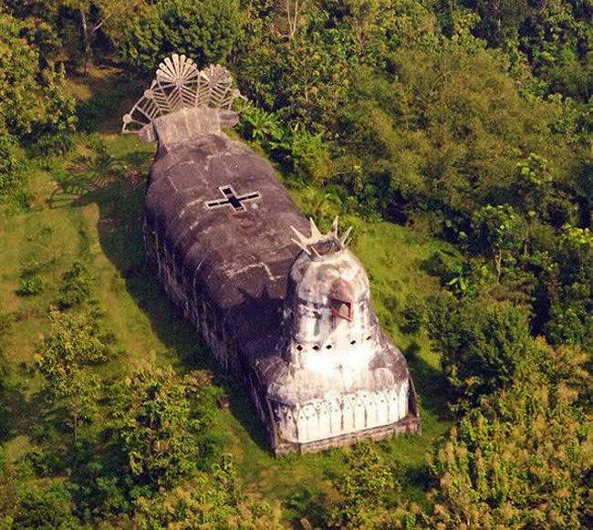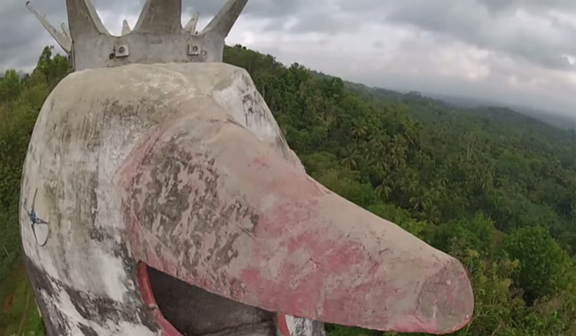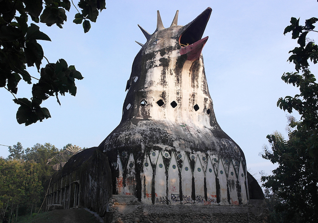 Нейтральное описание состоит в том, что это Gereja Ayam – молельный дом на острове Ява, район Магеланга, Индонезия. По идее, здание должно выглядеть как голубь, но местные назвали его куриной церковью. Так оно в интернете и фигурирует, Chicken Church. Строительство началось в 1990-е годы, инициатор – Даниэль Аламджа. В 1989-м во сне Бог вдохновил его построить это. Аламджа – христианин, но Gereja Ayam строился как дом для любой религии. Молиться, медитировать.