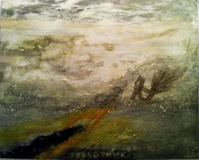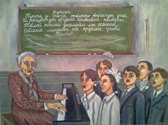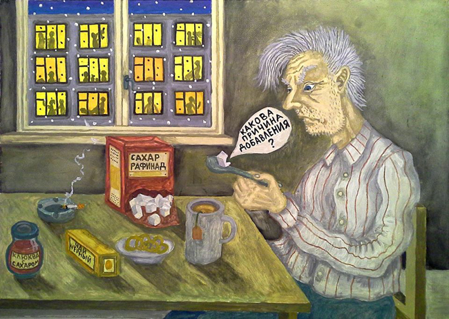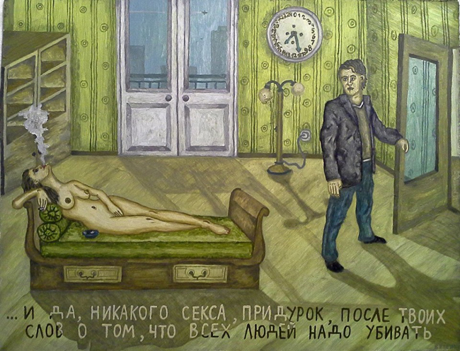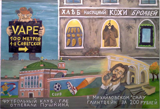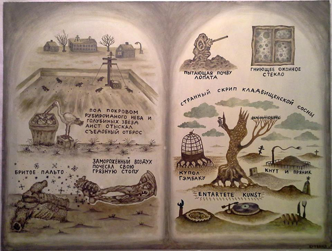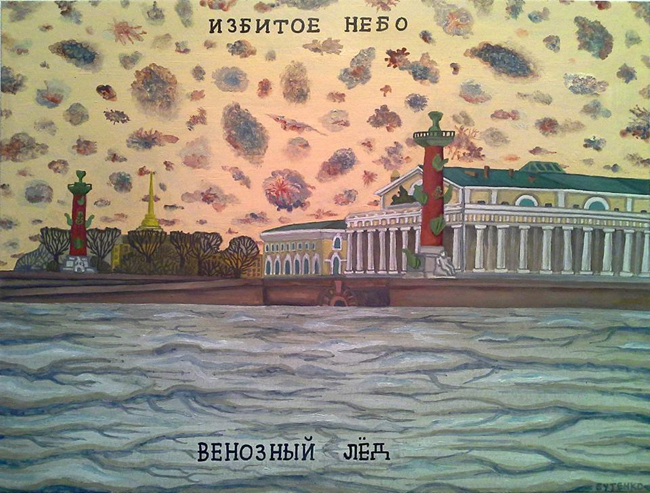 Так что нормально, когда на картинках много слов, СПб из них в сильной степени и состоит. А по части логики намеренных несовмещений логично вспомнить и Хармса. Вряд ли, конечно, она у него была именно конкретно «драматизацией идиотических проявлений действительности и идиотизацией драматических», как у НОМа, но очевидно, что без Хармса номовцы бы эту формулу не вывели. Сейчас будет не картина Бутенко.