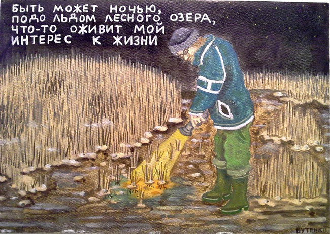 Тут переврано всё, как если бы анонс написал человек, совершенно посторонний и городу, и художественным практикам. Хотя проект «Дискурс», который это сообщил, как бы занимается новыми и непростыми трендами. Может, в природе что-то изменилось, довлеют новые факторы в лице социальных сетей, вайперов-самокатчиков и крафтовых алкоголей. Может, с такой позиции всё так и выглядит. Это, конечно, тоже интересно. Но Бутенко никакой не аутсайдер, причём у него совершенно петербургский вариант делания арта. Максимально приближённый к городу вариант. Отчасти его работы близки местным граффити – и по характеру изображений, и по склонности к этаким сдвинутым (или намеренно несобранным) смыслам в субтитрах. При этом – без малейшего (словесного и визуального) морализаторства. Наверное, Бутенко и граффити делает.