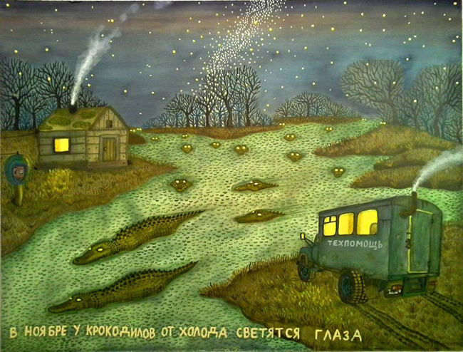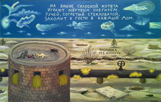 Это не нон-стоп-балаган. Можно разговаривать на языке балагана, но речь будет вовсе не о чём-то пустяковом, чтобы время провести. Нельзя сказать, что это лубок. Потому что это не лубок. Тот формализован как комедия дель арте, и в нём всегда мораль. Безусловно, всегда есть риск, что намерено примитивизируемое может сделаться просто примитивным, забыв о своём непростом происхождении. Ну, вот это, чтобы не казалось, что автор не умеет как-то иначе. Он даже буквы утопил в пейзаже.