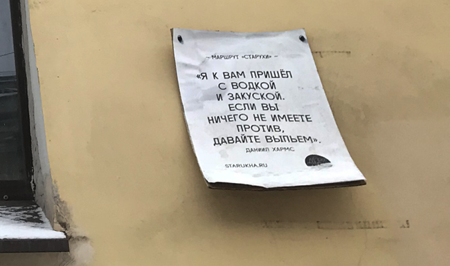 Это на доме, который как бы считается домом Хармса (левее картонки есть мемориальная доска). Собственно, чего ж в свой дом приходить как в гости, пусть даже и с бутылкой-закуской? Впрочем, это не совсем его дом. Его дом – соседний, точечно разбомбленный в войну, вместо него теперь бетонно-стеклянный новодел. И вот так там у них всё. Ну, а картонки на доме уже нет. Климат, сгнила, не восстановили, была разовая акция 2018-го.