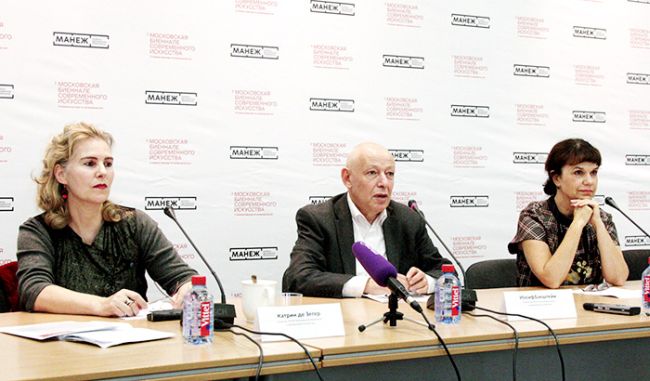 Катрин де Зегер и Иосиф Бакштейн на пресс-конференции биеннале