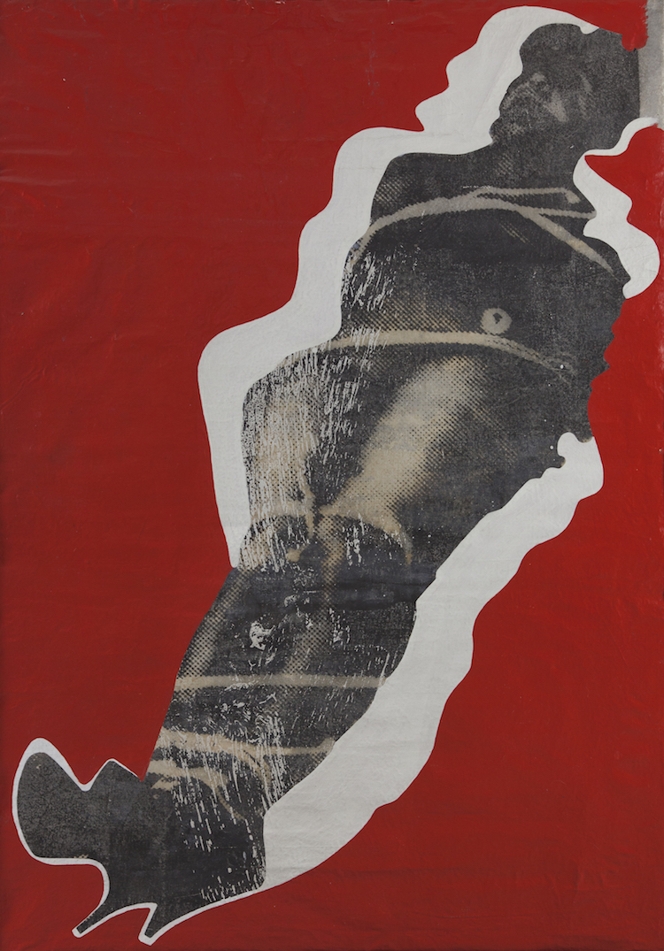 Boris Lurie. Love Series: Bound on Red. C. 1963. Photo emulsion, acrylic on canvas © Boris Lurie Art Foundation