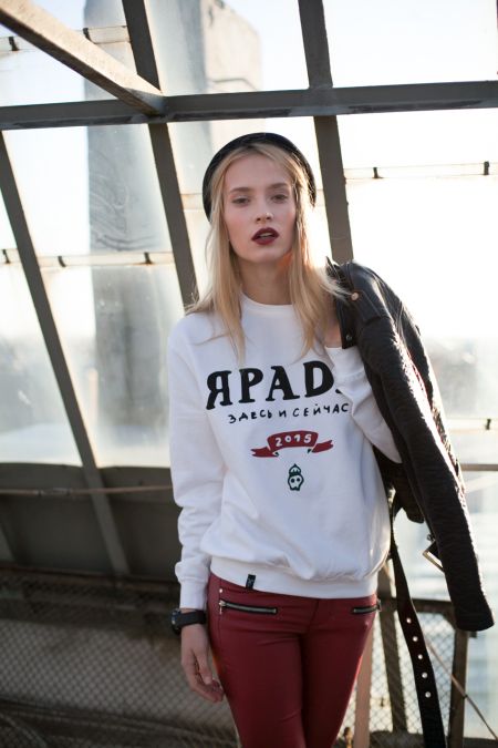 Я не могу предсказать, какие вещи станут наиболее популярны. Но зачастую это не самые «гармоничные», спокойные, а какие-то более яркие, даже «кричащие» модели. Возможно, уже сам бренд, его образ, подталкивает аудиторию к этому. Последнее время очень популярна модель легинсов с медведем, которая была создана вообще вне рамок какой-то коллекции, кажется, просто ко Дню Лачплесиса. Можно было бы сделать целую линейку таких зверей, но вот прошлой осенью меня вдохновила совсем другая тема – «район», рэп, гопники. И хитом этой темы стали джемперы, майки, шапки с надписью «ЯRADA. Здесь и сейчас». В минувшем году страсти вокруг этого принта не утихали. Это, конечно, по-своему забавно, что ты делаешь целую коллекцию, а люди потом приходят за одной конкретной вещью. Но мне нравится, что покупатели выбрали такой позитивный и в чём-то буддийский «месседж». Мне и самой он очень близок. Вообще вся эстетика лихих и переменчивых 90-х мне была очень интересна – бумеры, золотые цепи, крутые районные парни в тренировочных костюмах, бойцовские собаки, импортные толстовки с поддельными «брендами».