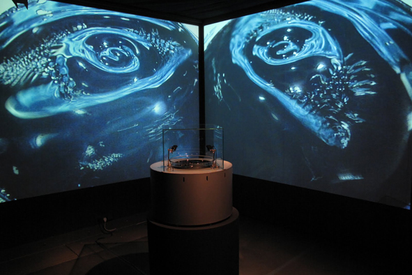 Принять участие в выставке я пригласил екатеринбургскую группу художников «Куда бегут собаки» с интерактивной инсталляцией «Поля 2.1». Это очень интересный проект, основанный на эффекте ферромагнитной жидкости, способной сильно поляризоваться в присутствии магнитного поля. Художники изготовили систему магнитов, напоминающих строение человеческого глаза – и это изображение, формируемое жидкостью, в итоге проецировалось на экраны. Куда бы вы ни перемещались, эти «глаза» следят за вами, подобно Большому Брату, ведут себя, как живые. Такой вот «взгляд» материи на человека.