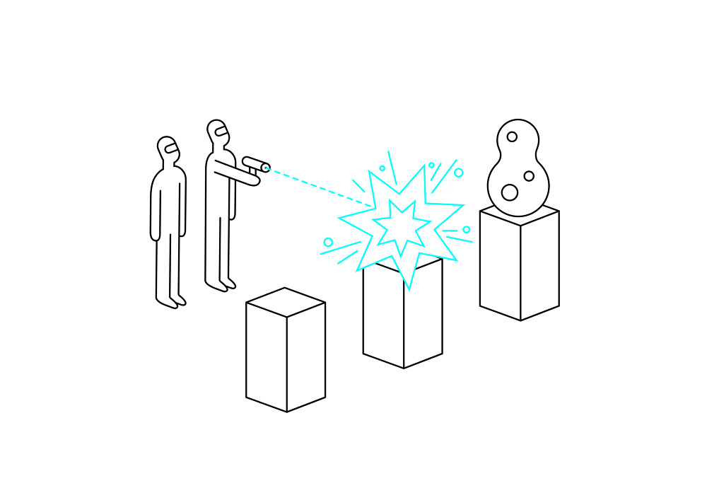 Софья Ласточкина. «Стиратели». В будущем искусство как отдельная сфера деятельности исчезнет. Общество достигнет расцвета науки и технологии, и они позволят всем визуализировать, генерировать, материализовать любые формы, которые им представятся. Мастерство художника как создателя уникальной формы потеряет свою ценность. Исчезнет художественное образование и понятие художника как профессии, его специализация. Симулякром искусства станет деятельность на стыке дизайна, рекламы и сферы развлечения. Каждый индивидуум сможет заниматься творчеством. Этого продукта будет становиться все больше и больше. Как ответ на это перепроизводство пустой, нерефлексивной, некритической массы образов и форм возникнет подпольное движение, секта, задачей которой станет очищение... Деятельность этих сообщников будет заключаться в хакерских атаках на электронные ресурсы, где хранится и выставляется псевдоискусство, и стирании всех файлов. Активисты будут проникать на площадки, где выставляются и продаются материальные продукты жизнедеятельности, псевдохудожников и уничтожать их при помощи дезинтегратора. Взамен уничтожаемых произведений они будут оставлять пустоту, которая бы не несла в себе никаких новых образов, смыслов и значений.