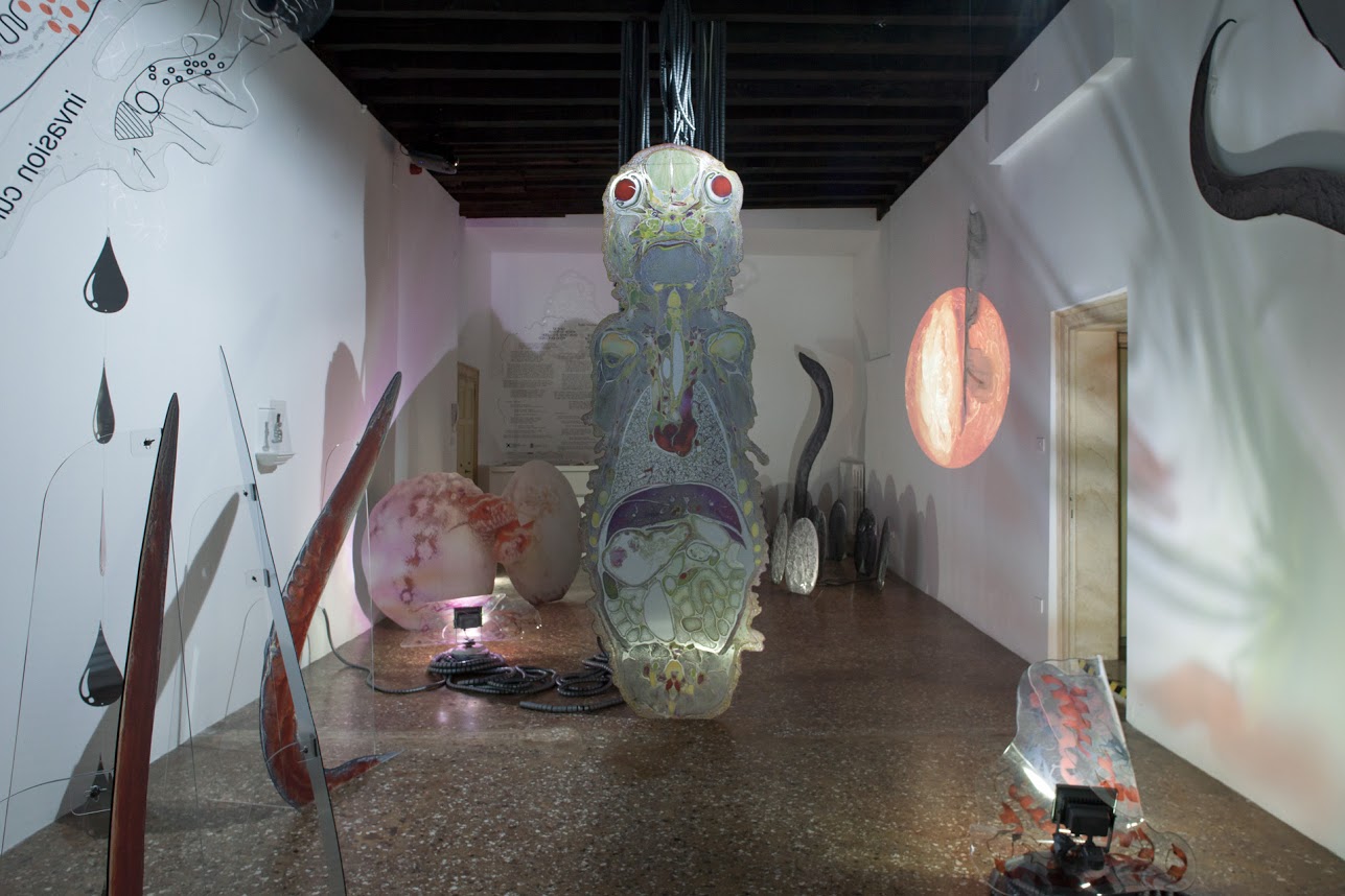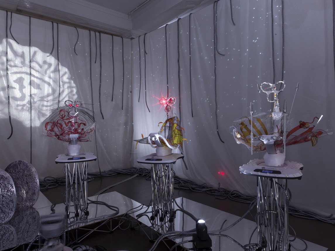 Это всё происходило постепенно, от выставки к выставке приходили новые идеи и материалы. Я начала делать маленькие скульптуры из пластика и полиуретана, и открыла, что в темноте и с определённой подсветкой этот пластик очень красиво выглядит. Стала развивать этот момент, а также свое давнее желание включить в систему нечто механическое и движущееся. Этим механическим элементом стали напоминающие роботов электроколыбели, эта идея в полной мере удалась в проекте в павильоне Эстонии на 57-й Венецианской биеннале, в Художественном музее KUMU и в галерее Whitechapel в Лондоне. Мне кажется, в KUMU это было решено лучше, чем в Венеции, а в Whitechapel я, в свою очередь, опробовала ещё несколько новшеств.