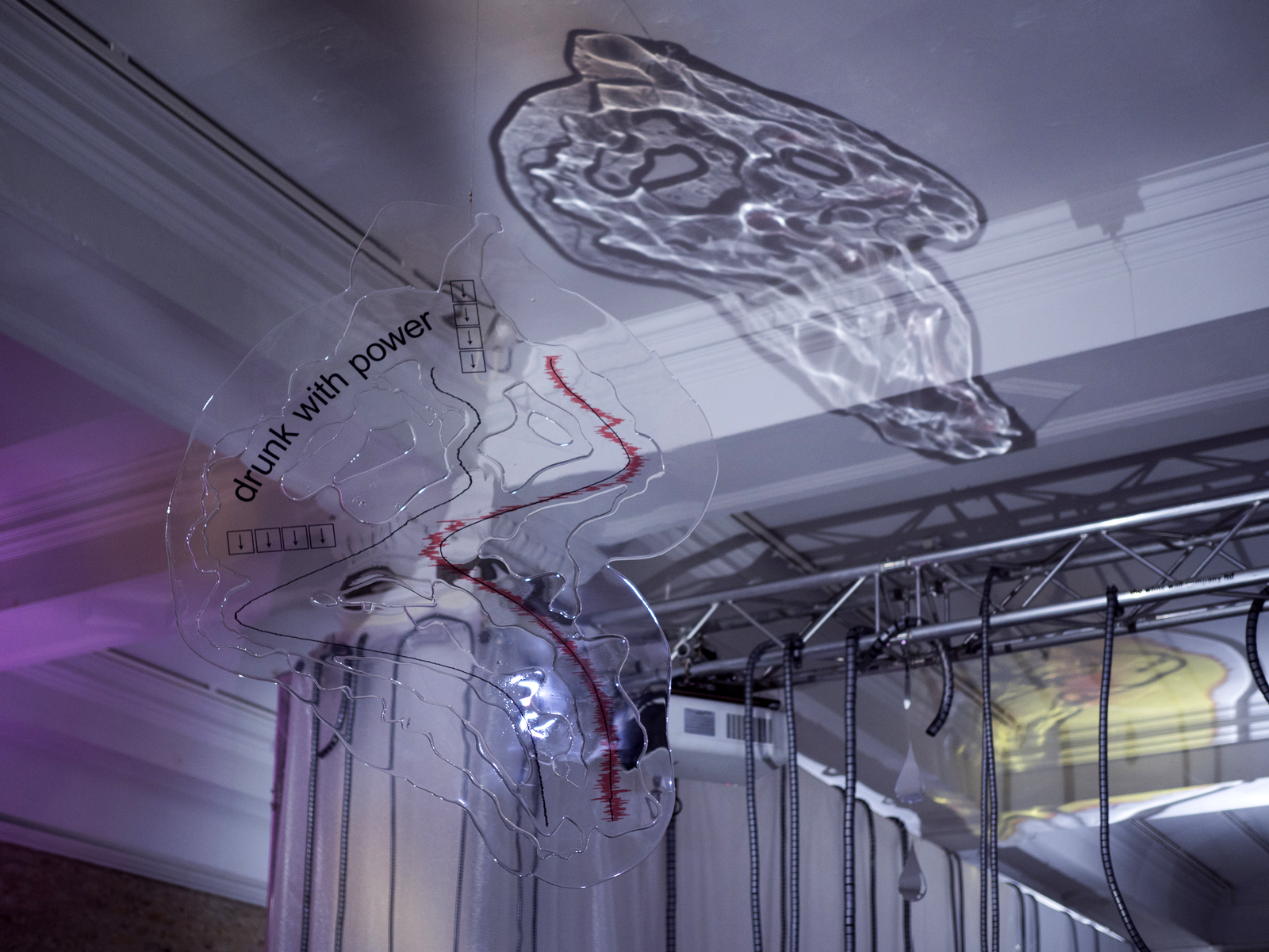 Идея лаборатории совмещалась с идеей мембраны между внешним и внутренним миром: пузырьковая плёнка-мембрана стала одновременно экраном и метафорой оболочки, соединяющей все элементы инсталляции в одно целое. Решение было бюджетное, но пузырьки полупрозрачной плёнки смотрелись на экране как пиксели, структурируя изображение, создавая ощущение виртуальности и пространственности. В результате я поняла, что если у меня будет новая выставка с хорошим бюджетом, в которой я продолжу работать с тотальностью, я хотела бы еще больше сотрудничать с архитектором, довести эту тотальность до архитектурных структур. Архитектурные элементы помогают создать атмосферу – выставка в Whitechapel ещё больше, чем экспозиция в KUMU, выглядит как съёмочная площадка фантастического фильма. Но, естественно, здесь возникает вопрос, хочу ли я, чтобы моя выставка походила на парк аттракционов: тут есть границы, которые мне не хотелось бы переходить. Мне хотелось бы, чтобы мои выставки были более интеллектуальными, а не напоминали Диснейленд.